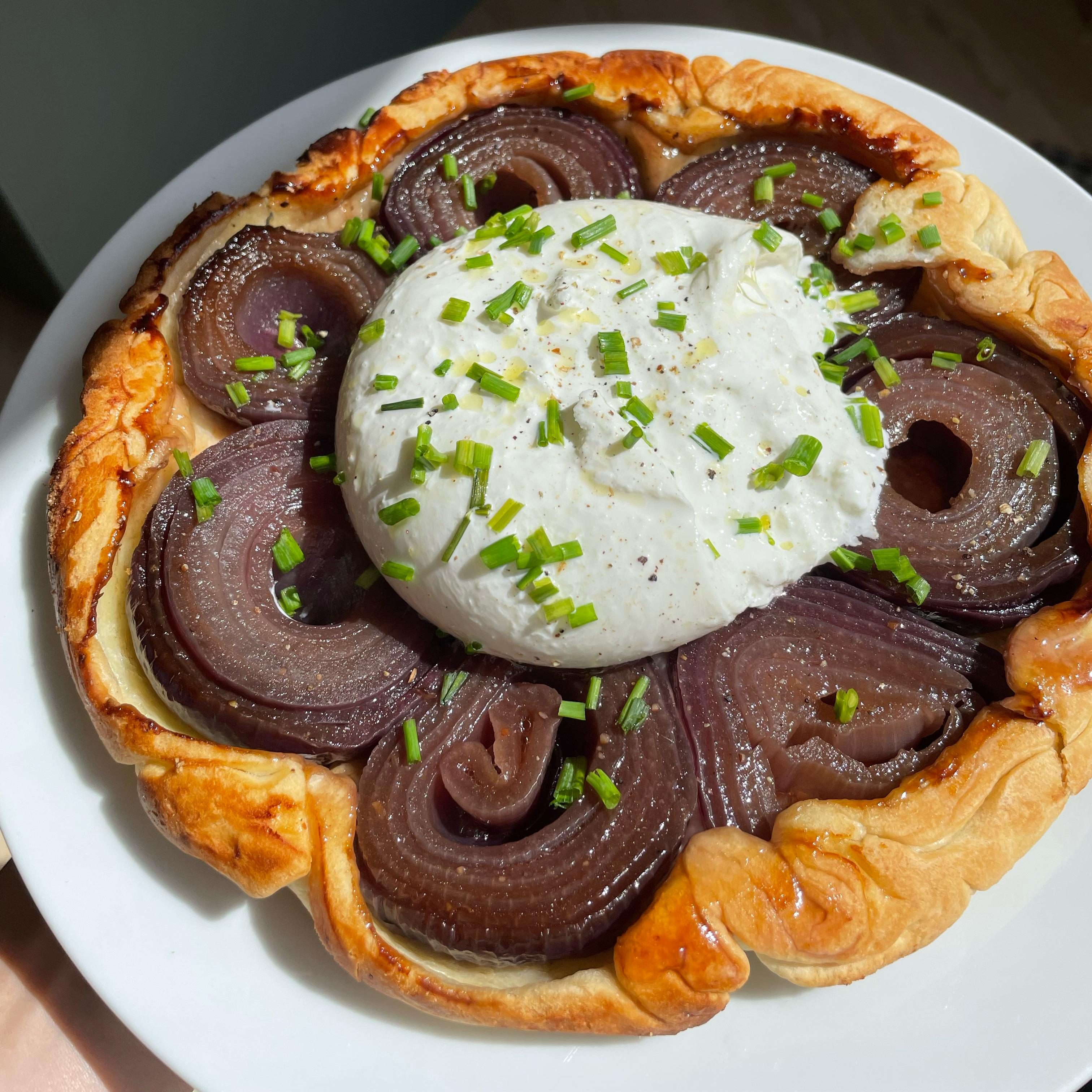 Épluchez et coupez les oignons en deux. Faites-les cuire à couvert dans une poêle avec de l’eau et du beurre. Le temps de cuisson dépendra de leur taille. Ils doivent être bien ramollis en fin de cuisson. N’hésitez pas à rajouter de l’eau au fur et à mesure. Retournez également vos oignons afin qu’ils soient bien cuits des deux côtés. En milieu/fin de cuisson, l’eau doit s’être évaporée afin de permettre la caramélisation des oignons. Vous pouvez donc retirer progressivement le couvercle ou, comme moi, les égoutter puis les replacer dans la poêle. Vérifiez que la plus belle face de vos oignons, c’est-à-dire la plus large, soit bien contre le fond de la poêle. Ajoutez le miel et le vinaigre balsamique. Faites dorer quelques minutes pour bien caraméliser les oignons. Laissez refroidir quelques minutes afin que le caramel adhère bien aux oignons. Égouttez éventuellement l’excédent de liquide. Placez les oignons dans un plat à tarte allant au four. Une fois encore, il faut que la face la plus large soit contre le plat. Disposez ensuite la pâte brisée sur les oignons en rabattant les bords vers l’intérieur du plat. Faites quelques petits trous pour faciliter la cuisson. Enfournez 25 minutes à 200 °C. Retournez la tarte sur une assiette, puis ajoutez la burrata avec l’assaisonnement : sel, poivre, piment d’Espelette et ciboulette.