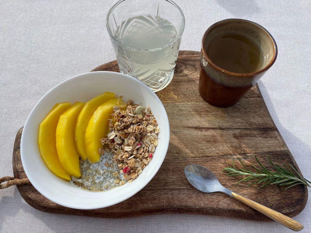 -Le lendemain, sortir le pudding et ajouter les toppings : la moitié d’une mangue coupée en rondelles, un peu de muesli et une pointe de sirop d’agave.